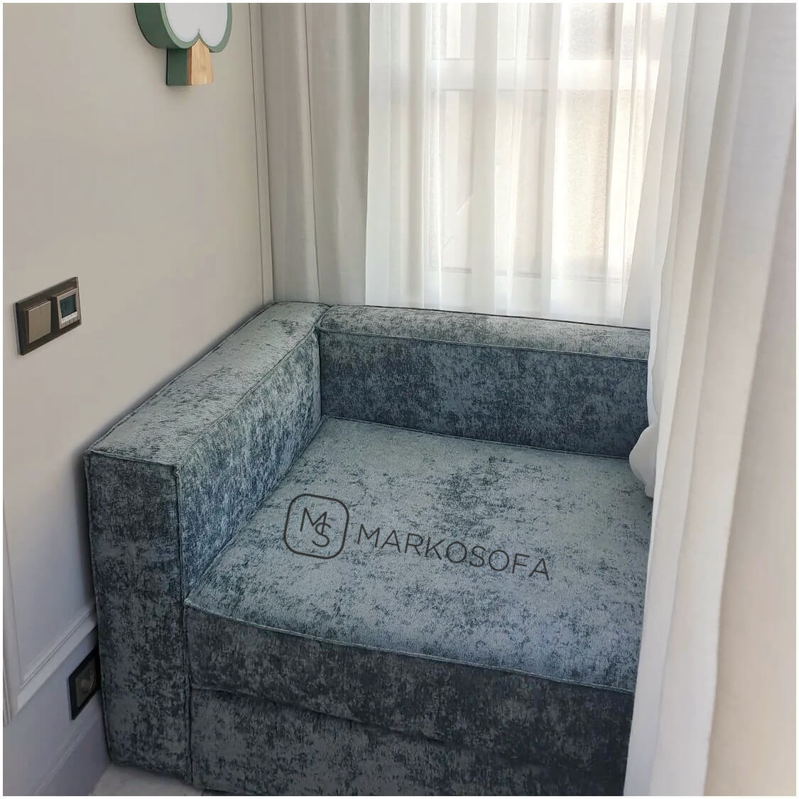 Механизм прячется в нижней части дивана за царгой. Выкатывается, если потянуть, а затем поднимается при помощи текстильной петли до уровня основного места посадки. Вы получаете полноценное место для сна